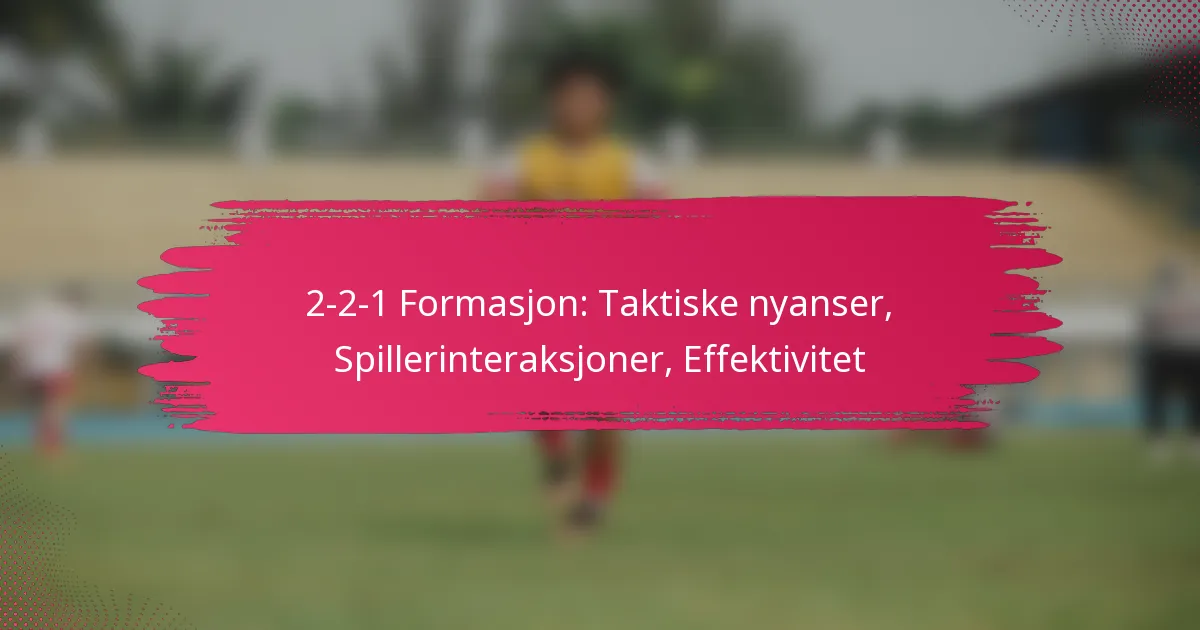 2-2-1-formasjonen er en taktisk oppstilling som har to forsvarsspillere, to midtbanespillere og én spiss, designet for å skape balanse mellom forsvar og angrep. Denne strukturen letter ikke bare effektiv ballkontroll og overgangsspill, men forbedrer også romforvaltningen, noe som gjør at lag kan tilpasse strategiene sine mot forskjellige motstandere. Å forstå de distinkte rollene og samhandlingene mellom spillerne i denne formasjonen er essensielt for å optimalisere dens effektivitet i ulike spillscenarier.